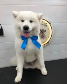 This adorable, freshly groomed fluffy dog is sitting calmly after a professional grooming session, looking clean, soft, and perfectly styled. The bright white coat is neatly trimmed, and the cute blue bow adds a charming touch, highlighting the care and attention given during grooming. The relaxed posture and happy expression show how comfortable and stress-free the experience was for the pet.