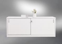 GP Credenza Buffet in Glossy White 1800mm Width Buffet to match reception counters. Two sliding lockable doors with chrome handles. Finished in high quality 2 pack paint in Gloss White Flat Pack, Assembly is required Dimension: 1800 x 450 x 720H