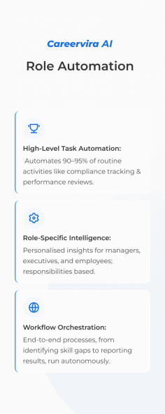 Streamline enterprise L&D with Careervira AI Role Automation. Automate 90–95% of routine tasks, enable role-specific intelligence, and orchestrate end-to-end workflows—from skill gap analysis to performance tracking—with AI.